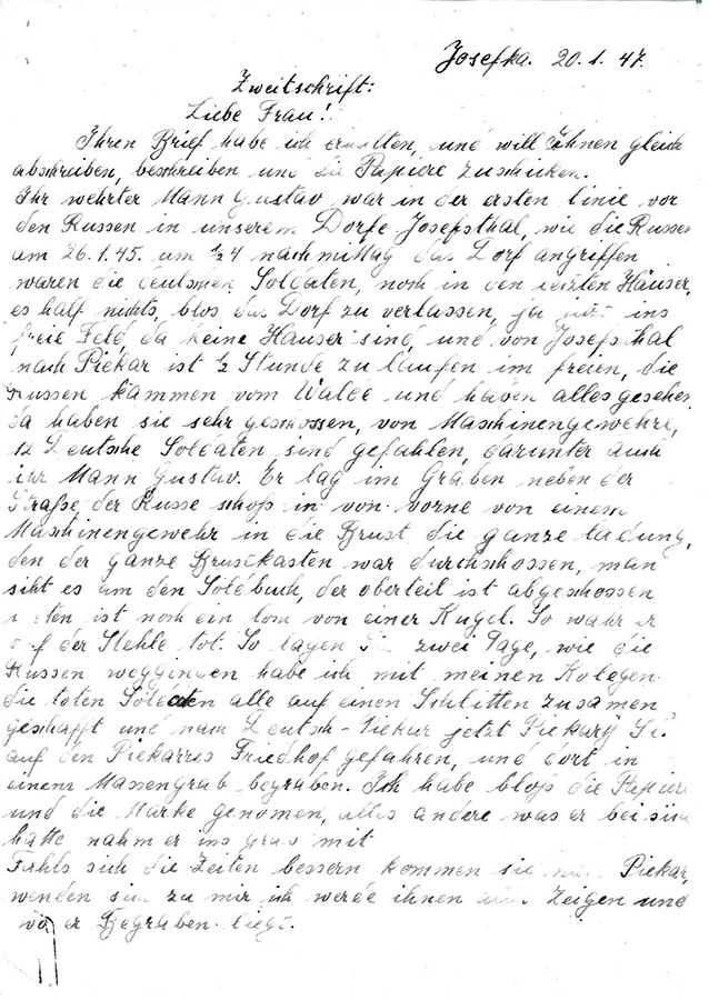 Poniżej przedstawiamy tłumaczenie listu mieszkańca Józefki, opisującego wydarzenia związane ze styczniem 1945 roku, skierowanego do wdowy po jednym z żołnierzy poległych w tym starciu.