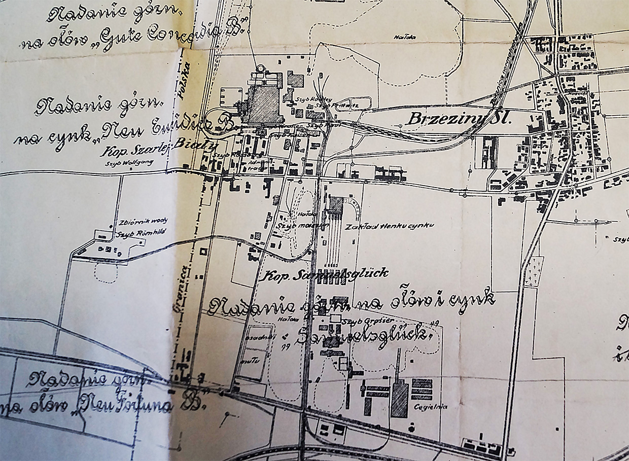 Fragment mapy z przełomu lat 20/30. przedstawiająca rejon kopalni Biały Szarlej oraz kopalni Samuelglück