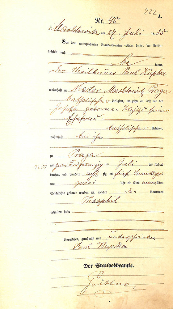 Akt urodzenia Teophila Kupki. Źródło: AP Katowice, oddział w Cieszynie 14/450/2, str. 222