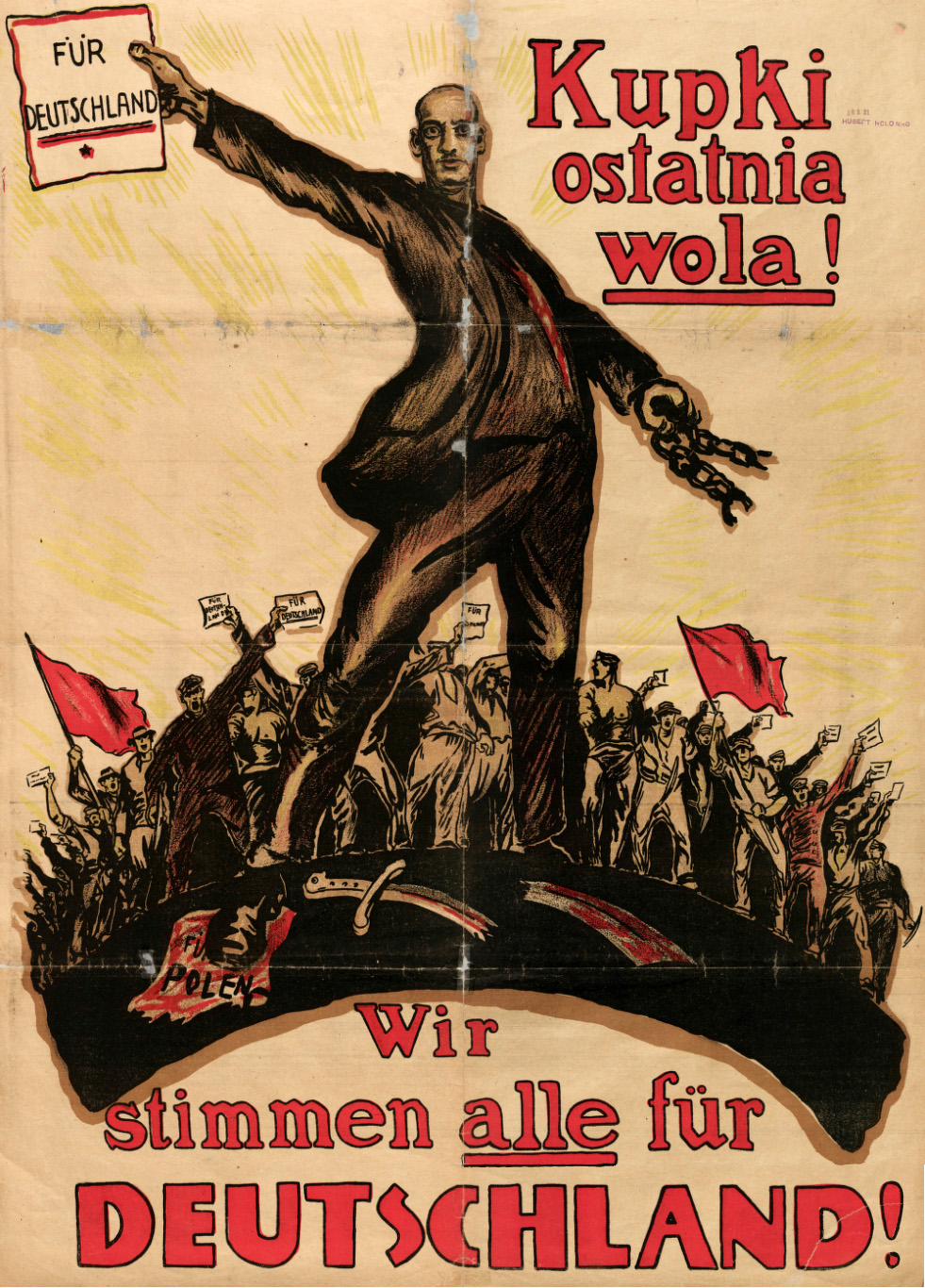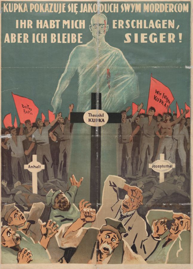 Podobizna Teofila Kupki wykorzystana na niemieckim plakacie propagandowym. Na symbolicznych krzyżach umieszczono nazwy miejscowości: Anhalt (dziś Hołdunów), gdzie w czasie II powstania śląskiego spalono część zabudowań, oraz Josephsthal (Józefka), w której polscy powstańcy rozstrzelali czternastu cywilów niemieckich.