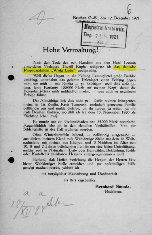 Najważniejszym fragmentem listu, w kontekście tych rozważań, jest określenie „deutsche Propagandablatt »Wola Ludu«”, czyli „niemiecka gazeta propagandowa”, która – jak twierdzi Smuda – wyrządziła wiele szkód polskiemu komisariatowi.