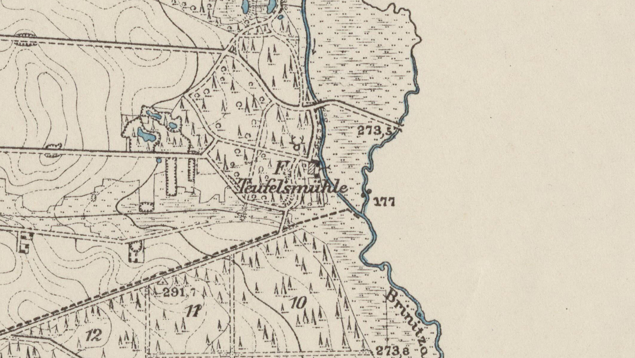 Niemiecka mapa z roku 1901 z zaznaczonym młynem i widoczną granicą. Źródło: https://igrek.amzp.pl/