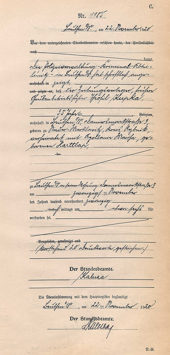 Treść: 22.11.1920. Wydział Kryminalny Administracji Policyjnej w Beuthen O/S pisemnie poinformował, że wydawca prasy, wcześniej kierownik kopalni Theofil Kupka, 35 lat, zamieszkały w Beuthen O/S, Damersmarktstrasse 9, urodzony w Nieder Marklowitz, powiat Rybnik, żonaty z Apollonie Martha z domu Harttlap, zmarł w swoim mieszkaniu w Beuthen O/S przy Damersmarktstrasse 9, 20.11.1920 ok. godziny osiemnastej.