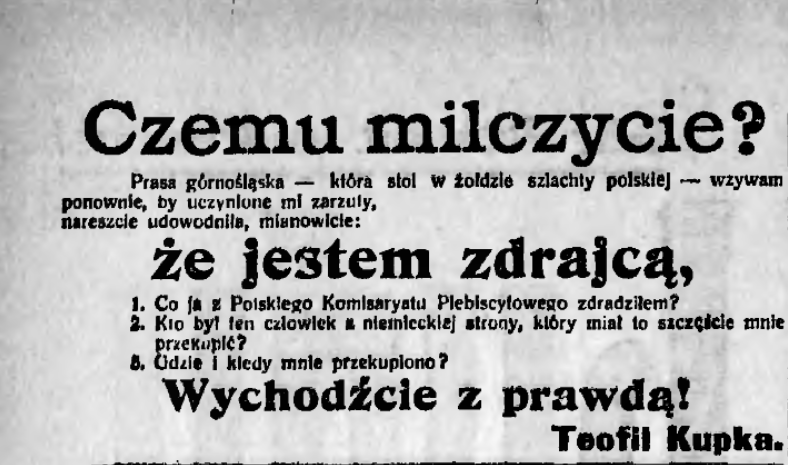 »Wobec tego, że p. Kupka, jako przewodniczący naszego związku wydał szereg odezw, nadużywając przytem naszych nazwisk i nazwy naszego zrzeszenia, oświadczamy, że jaknajostrzej potępiamy robotę p. Kupki, która nie jest zgodną z programem naszego Związku Górnośląskich Pracowników Plebiscytowych. Robota p. Kupki jest robotą niemiecką. Pana Kupkę wykluczamy z naszego zrzeszenia, gdyż samowolna, bolszewizmem pachnąca robota jest szkodliwą dla naszej sprawy narodowej.Wobec tej podłej roboty p. Kupki, fałszującego pod swemi odezwami podpis naszego Związku Górnaśląskich Pracowników Plebiscytowych ,uchwałą dzisiejszą rozwiązujemy nasze zrzeszenie. Z. Z. P. P. już nie istnieje. Zaznaczamy jednocześnie, że nie mamy nic wspólnego ze samozwańczym Górnośląskim Komitetem Plebiscytowym p. Kupki.
